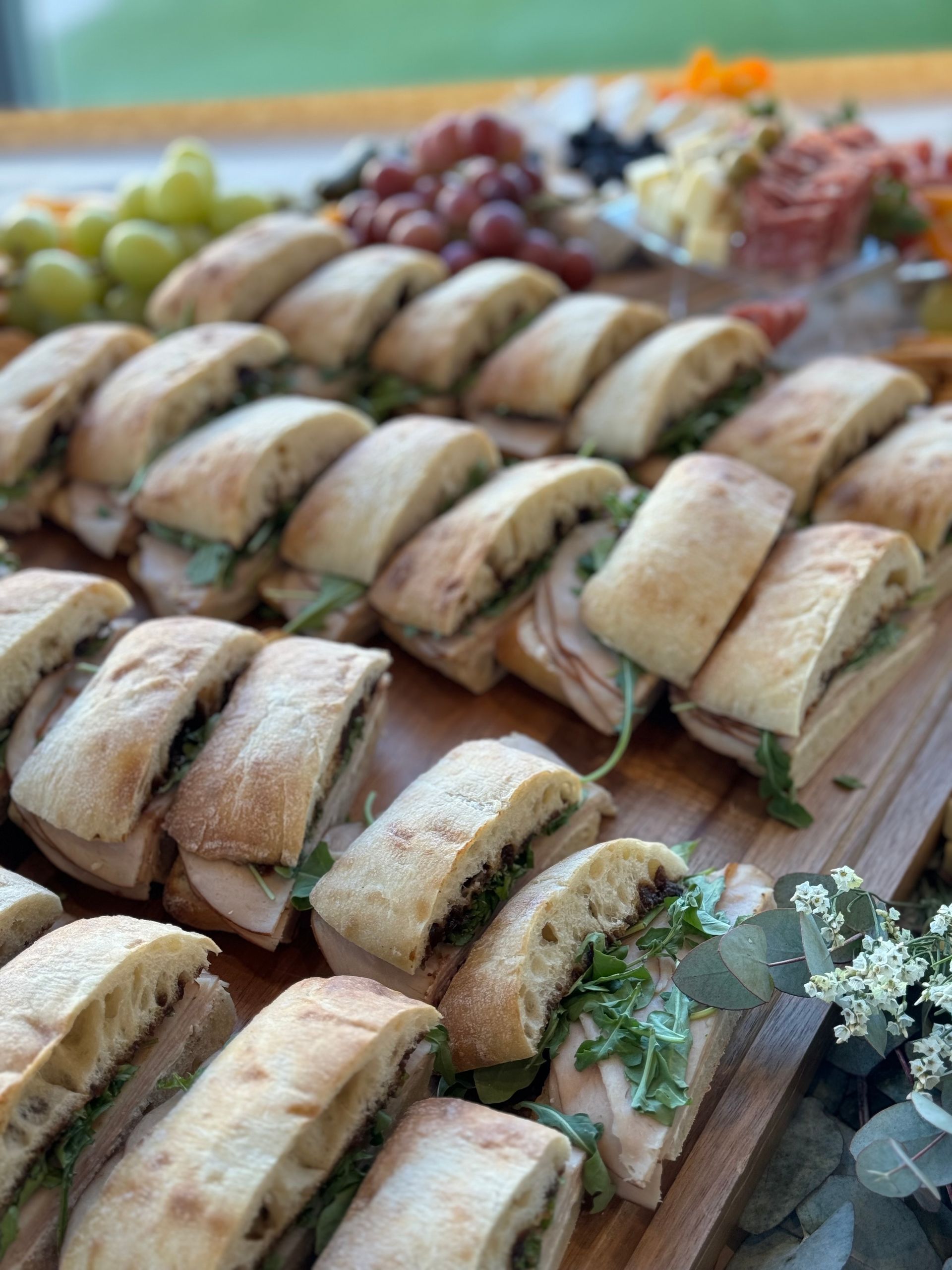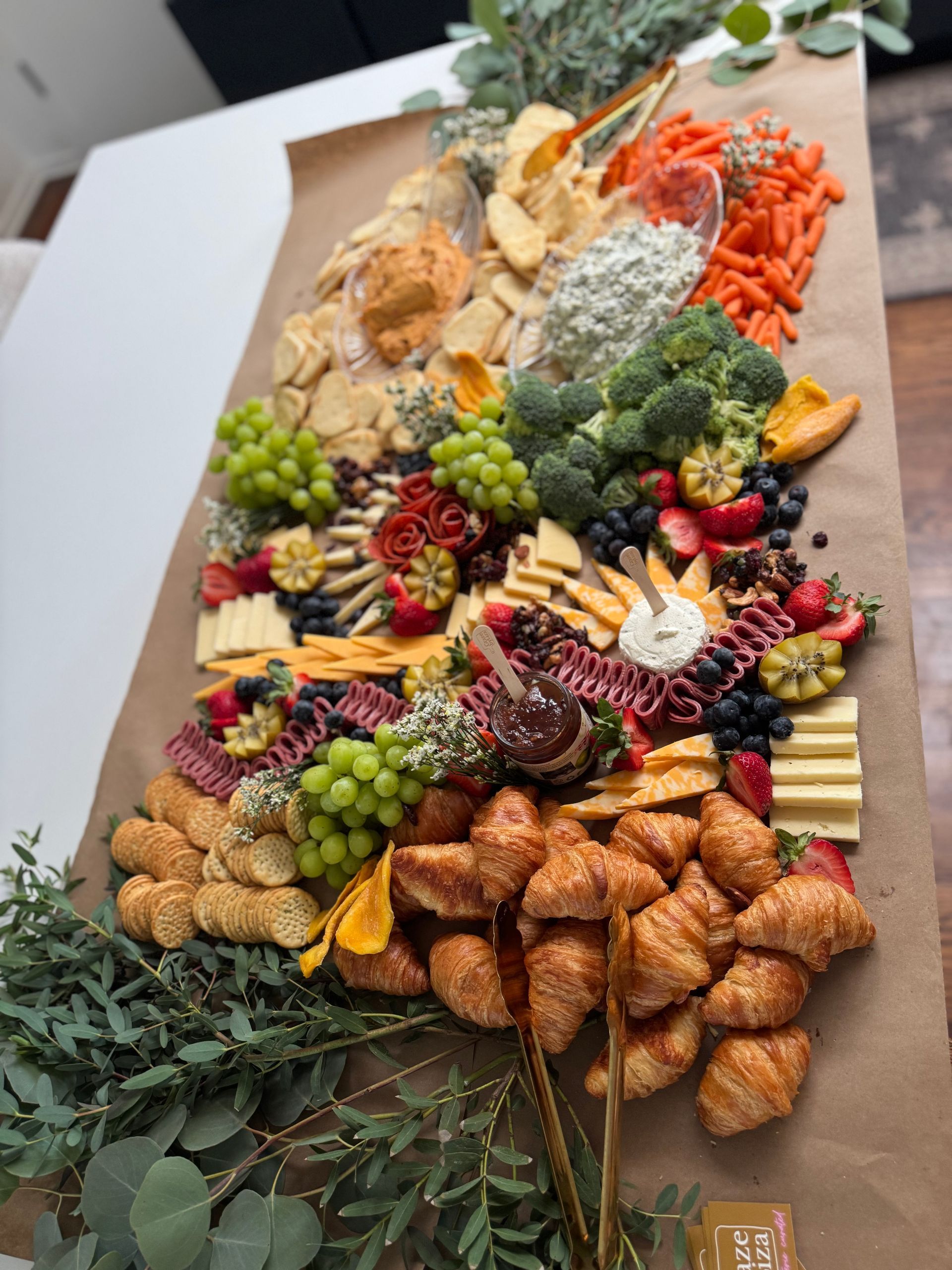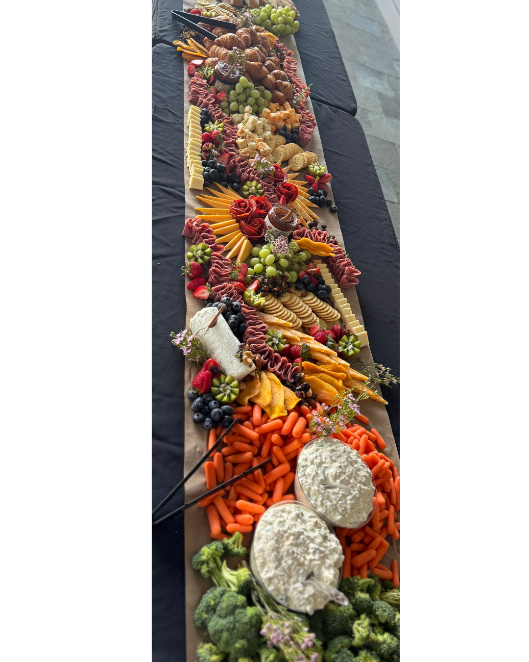 A decorated experience-a full grazing table spread with a customized selection of meats, cheeses, seasonal garnishes and jams & spreads, hummus, pita, veggies and dip.