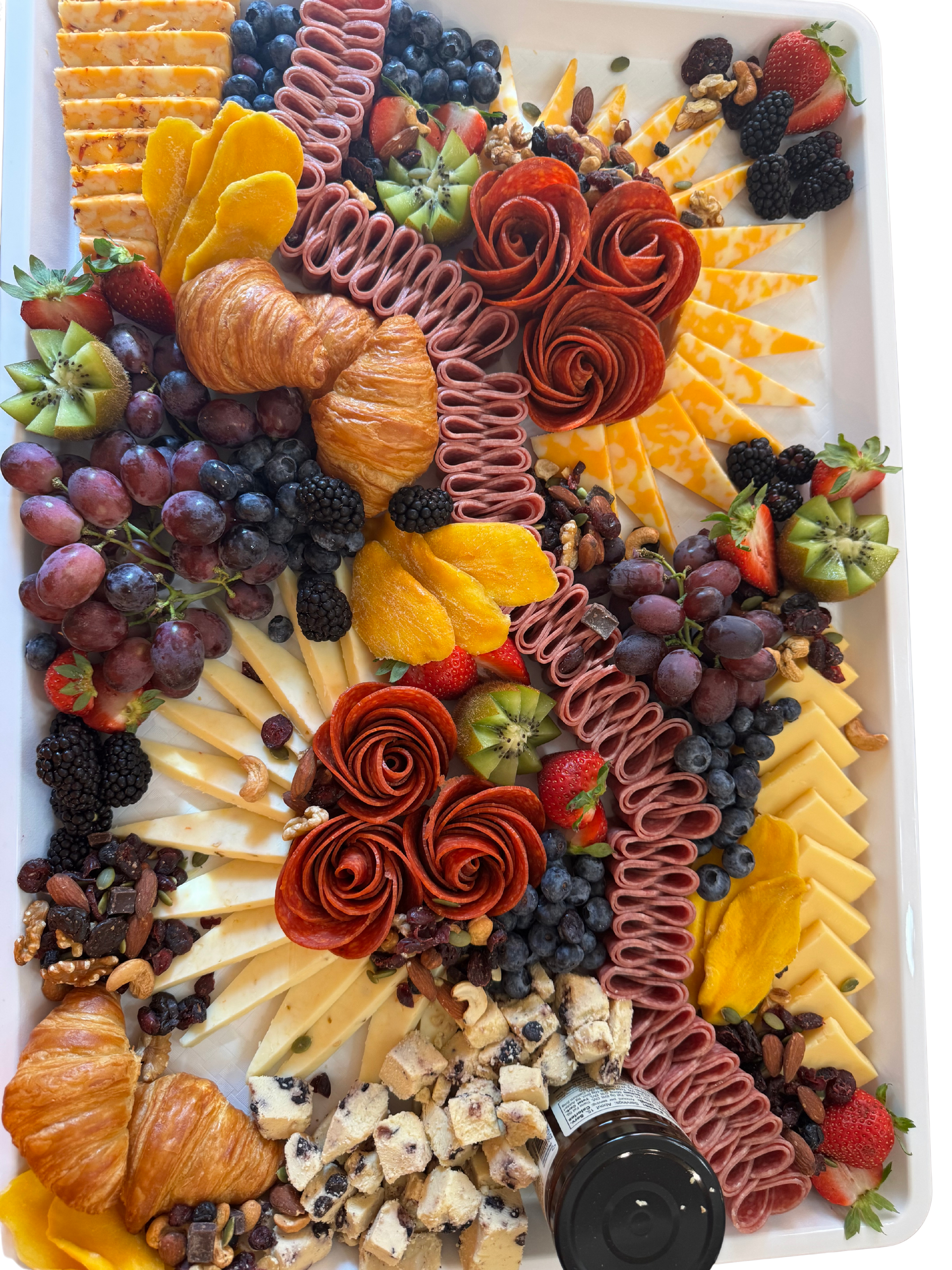Customized charcuterie boards with selection of meats, cheeses, seasonal garnishes and spreads. Assortment of crackers included.